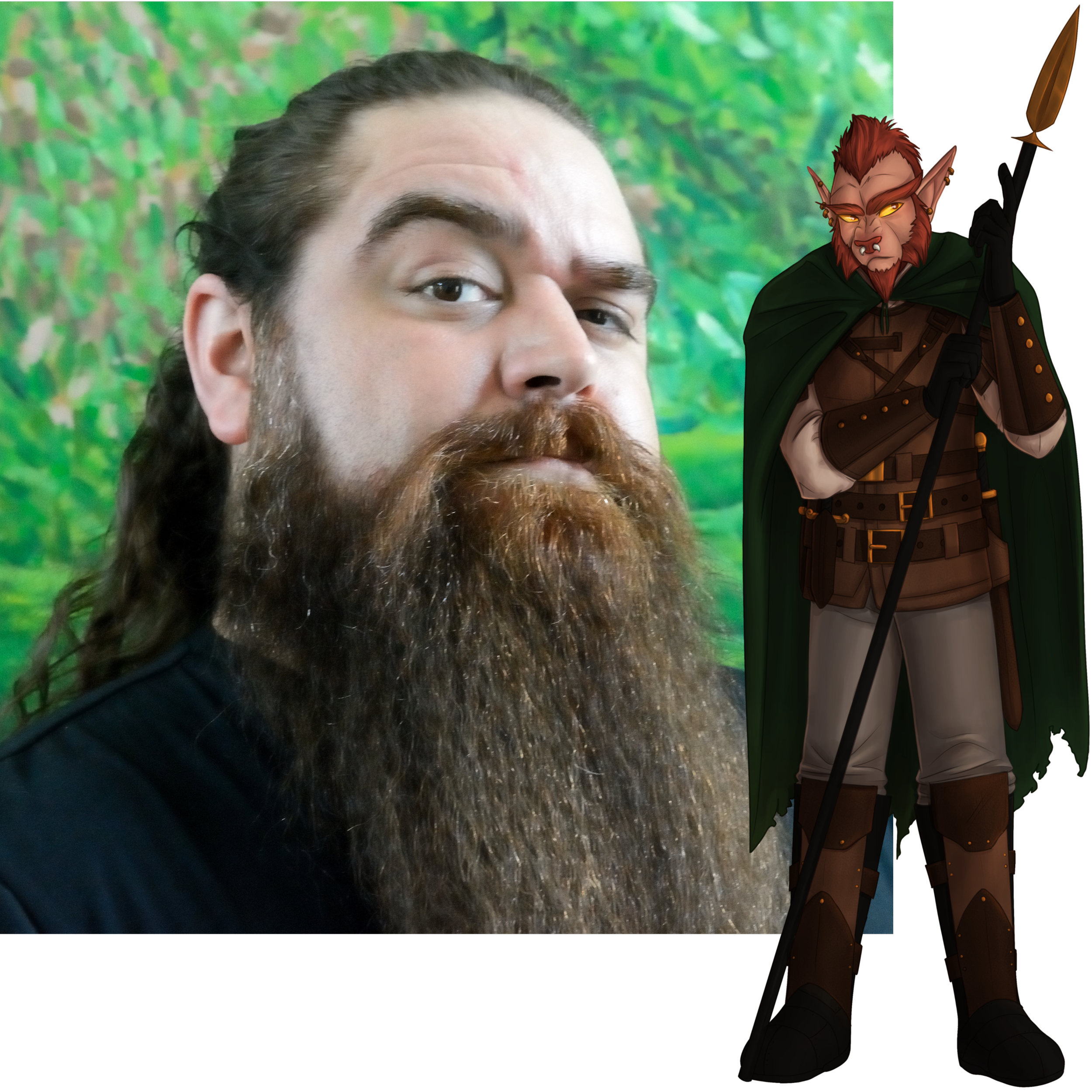 A software engineer with an over-sized funny bone, Cody plays as the bugbear Warlock, Lahg Jamen, often serving as a walking reminder that Dice of Ages is not meant for children. Lahg embodies the “Find Out” phase of the well-known idiom, even when his intentions are purely benevolent in nature. The resulting repercussions of his brand of "help" ensure that The Argent Flame will never be in short supply of nigh-unexplainable shenanigans.